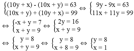 Bài 37 trang 13 Sách bài tập Toán 9 Tập 2: Cho một số có hai chữ số. Nếu đổi chỗ hai chữ số của nó thì được một số lớn hơn số đã cho là 63. Tổng của số đã cho và số mới tạo thành bằng 99. Tìm số đã cho.