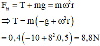 14.4. Một người buộc một hòn đá vào đầu một sợi dây rồi quay dây trong mặt phẳng thẳng đứng. Hòn đá có khối lượng 0,4 kg, chuyển động trên đường tròn bán kính 0,5 m với tốc độ góc không đổi 8 rad/s. Lấy g = 10 m/s2. Hỏi lực căng của dây khi hòn đá ở đỉnh của đường tròn ?