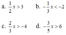 c. Ta có: 2/3 x > -4 ⇔ 2/3 x. 3/2 > -4. 3/2 ⇔ x > -6