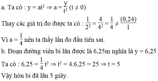 Bài 5 trang 47 Sách bài tập Toán 9 Tập 2: Đố : Một hòn bi lăn trên một mặt phẳng nghiêng. Đoạn đường đi được liên hệ với thời gian bởi công thức y = at2, t tính bằng giây, y tính bằng mét. Kết quả kiểm nghiệm được cho bởi bảng sau :