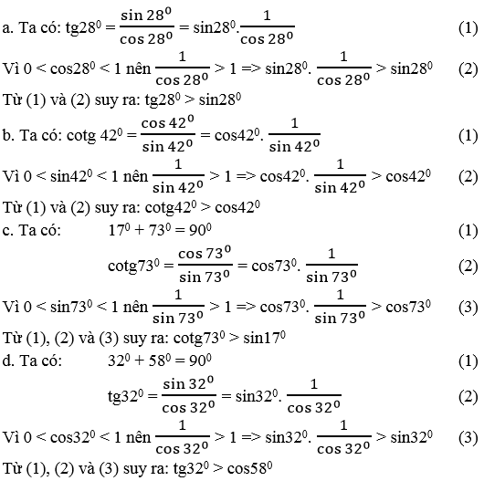 Bài 48 trang 112 Sách bài tập Toán 9 Tập 1: Không dùng bảng lượng giác và máy tính bỏ túi, hãy so sánh: