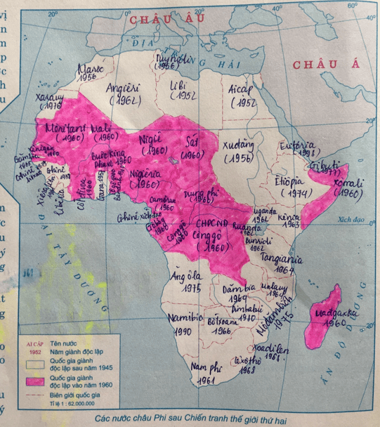b. Tô màu hồng đậm vào các nước châu Phi giành được độc lập vào năm 1960, các nước còn lại tô màu hồng nhạt (lưu ý hoàn thành bảng chú giải).