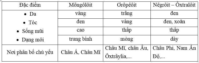 Bài 1 trang 30 Tập bản đồ Địa Lí 10: Dựa vào hình 33.1 và hình 33.2 ban nâng cao kết hợp với nội dung SGK, em hãy điền vào chỗ chấm (...) ở bảng sau những nội dung phù hợp thể hiện đặc điểm và sự phân bố các chủng tộc chính trên thế giới.