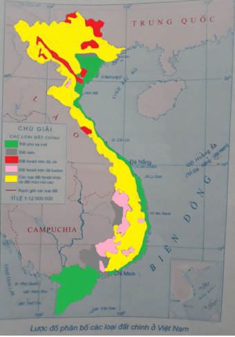 Bài 1 trang 40 Tập bản đồ Địa Lí 8: Dựa vào lược đồ hình 36. 2 trong SGK, đối chiếu với lược đồ bên, em hãy tô màu vào chú giải và lược đồ để thấy rõ sự phân bố các loại đất chính ở nước ta.