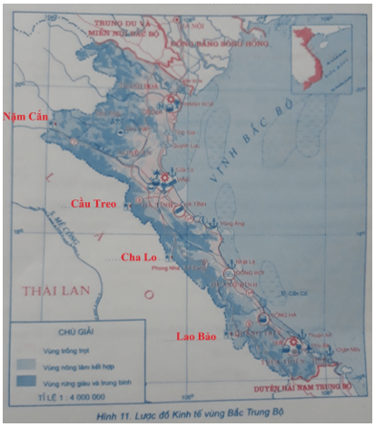 -Điền tên các cửa khẩu Nậm Cắn, Cầu Treo, Cha Lo, Lao Bảo vào chỗ chấm (…) ở lược đồ dưới đây.