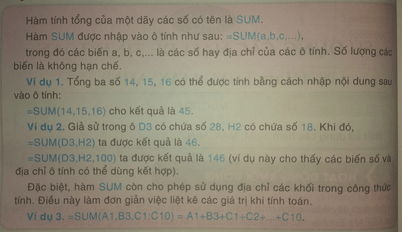 a) Trong chương trình bảng tính có hàm SUM để tính tổng một dãy, hàm MAX để xác định giá trị lớn nhất trong một dãy số, hàm MIN để xác định giá trị nhỏ nhất trong một dãy số. Cách sử dung những hàm này tương tự như hàm AVERAGE. Hãy đọc nội dung sau để tìm hiểu cách sử dụng hàm tính tổng.