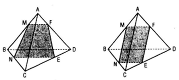 c) Có thể. Giả sử mặt phẳng cắt là (P) qua điểm M thuộc đoạn AB , song song với BD và AC . Khi đó thiết diện là hình bình hành MNEF