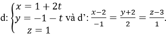 Đường thẳng d đi qua M(1; -1; 1) và có vectơ chỉ phương u→(2; -1;0) d’ đi qua M’(2; -2; 3) và có vectơ chỉ phương u'→(-1;1;1)