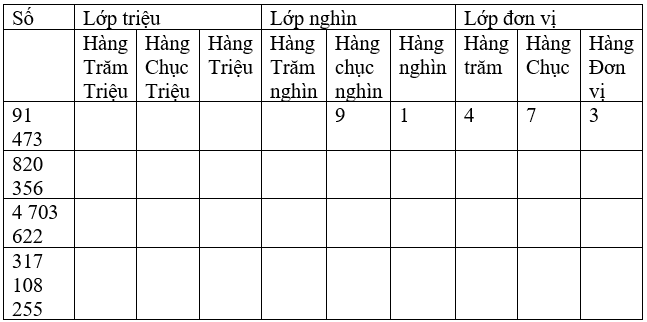 | Hàng Trăm Triệu | Hàng Chục Triệu | Hàng Triệu | Hàng Trăm nghìn | Hàng chục ghìn | Hàng nghìn | Hàng trăm | Hàng Chục | Hàng Đơn vị | ||