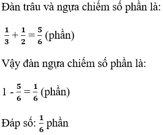 Câu 5. (trang 51 Toán 4 VNEN Tập 2). Có một đàn trâu, bò và ngựa đang ăn cỏ. Số trâu chiếm đàn, số ngựa chiếm
