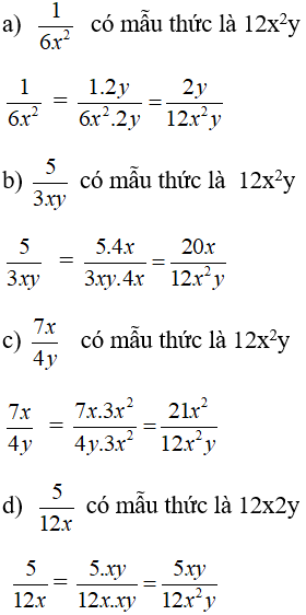 Dùng tính chất cơ bản của phân thức, hãy viết mỗi phân thức sau dưới dạng phân thức có mẫu số là 12x2y: