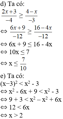 d) Ta có: - 3x ≥ 6 ⇔ x ≤ 6 : (- 3) ⇔ x ≤ - 2