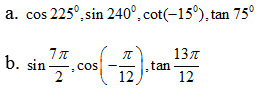 Bài 1 (trang 153 SGK Đại Số 10): Tính a) cos225o, sin240o, ...