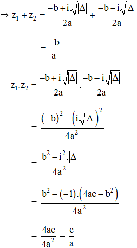 Bài 4 (trang 140 SGK Giải tích 12): Cho a, b, c ∈ ℝ, a ≠ 0, z1, z2 là hai nghiệm của phương trình az2 + bz + c = 0. Hãy tính z1+z2 và z1.z2 theo hệ số a, b, c.