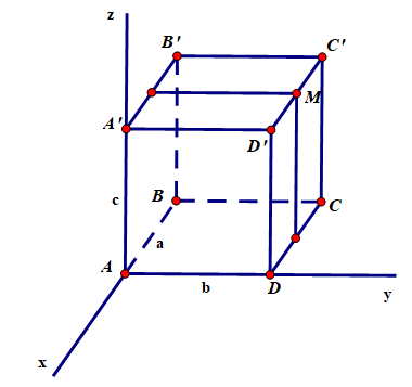 Trả lời câu hỏi Toán 12 Hình học Bài 1 trang 64: Trong không gian Oxyz, cho hình hộp chữ nhật ABCD.A’B’C’D’ có đỉnh A trùng với gốc O, có AB→, AD→, AA'→ theo thứ tự cùng hướng với i→ , j→ , k→ và có AB = a, AD = b, AA’ = c. Hãy tính tọa độ các vecto AB→ ,AC→ , AC'→ và AM→ với M là trung điểm của cạnh C’D’.