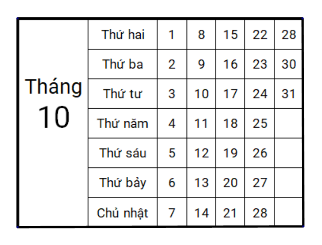 b) Ngày cuối cùng của tháng 10 là thứ tư.