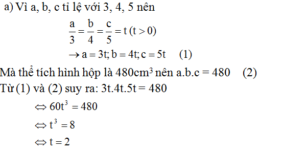 Bài 11 (trang 104 SGK Toán 8 tập 2): a) Tính các kích thước của một hình hộp chữ nhật, biết rằng chúng tỉ lệ với 3, 4, 5 và thể tích của hình hộp này là 480cm3.