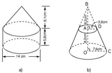b) Thể tích cần tính là một hình nón cụt, chiều cao 8,2cm; bán kính đường tròn của đáy trên và đáy dưới theo thứ tự là 3,8cm và 7,6cm. Cách tính là lấy thể tích hình nón lớn trừ đi thể tích hình nón bé.