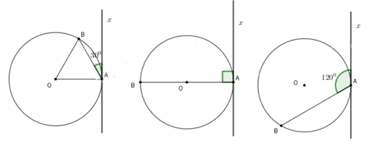 a) Hãy vẽ góc BAx tạo bởi tia tiếp tuyến và dây cung trong ba trường hợp sau: