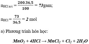 Bài 2. (Trang 78 VBT Hóa học 9 ) Tính thể tích khí clo thu được ở đktc khi cho 200g dung dịch HCl 36,5% tác dụng với MnO2 dư. Từ lượng clo này có thể điều chế được bao nhiêu gam sắt (III) clorua. Biết hiệu suất của mỗi phản ứng đều là 80%