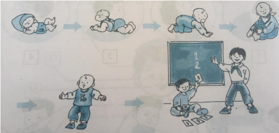Sự lớn lên của bạn nhỏ trong hình: từ sơ sinh – lẫy – biết bò - biết ngồi - biết đi – bé biết học.