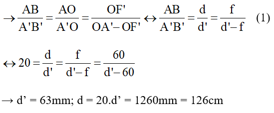 Ta đặt OA = d; OA’ = d’; AB = 720 mm; A’B’ = 36 mm; f = 6 cm = 60 mm