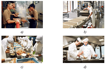- GV yêu cầu HS quan sát hình ảnh và sắp xếp nghề nghiệp thích hợp tương ứng với mỗi hình ảnh: 1) Thợ chế biến thực phẩm; 2) Thợ vận hành máy sản xuất thực phẩm; 3) Đầu bếp trưởng; 4) Người chuẩn bị đồ ăn nhanh.