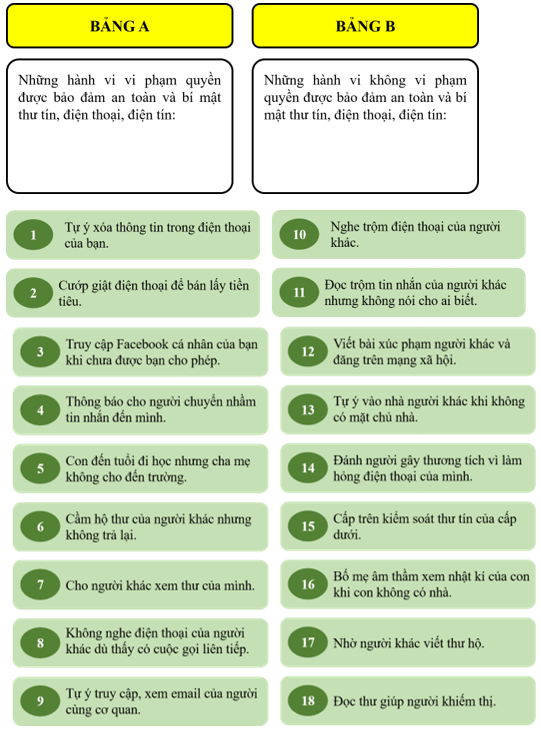 - GV phổ biến luật chơi cho HS: Mỗi nhóm là một đội, trong thời gian 5 phút hãy xác định các hành vi vi phạm/không vi phạm quyền được bảo đảm an toàn và bí mật thư tín, điện thoại, điện tín. Sau đó hãy sắp xếp các hành vi vào 2 bảng A, B sao cho đúng. Hết thời gian quy định, đội nào sắp xếp được nhiều hành vi đúng và nhanh hơn thì thắng.