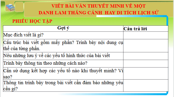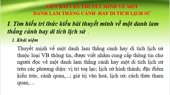 Giáo án điện tử bài Viết bài văn thuyết minh về một danh lam thắng cảnh hay di tích lịch sử - Văn 9 Chân trời sáng tạo