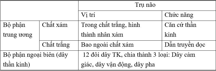 + YC HS đọc TT tr 144: + Nêu cấu tạo và chức năng của trụ não? + GV hoàn thiện kiến thức. + Giới thiệu: Từ nhân xám xuất phát 12 đôi thần kinh não gồm dây cảm giác, dây vận động và dây pha. |