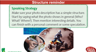 Describe the photo using the structures and strategy on the screen. Volunteer to answer. Look, listen, and repeat in chorus and individuals. Answer the question and give reasons. Volunteer to share ideas. |