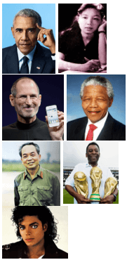 7 famous people: 1. Barack Obama 2. Dang Thuy Tram 3. Steve Jobs 4. Nelson Mandela 5. Vo Nguyen Giap 6. Pelé 7. Michael Jackson |
