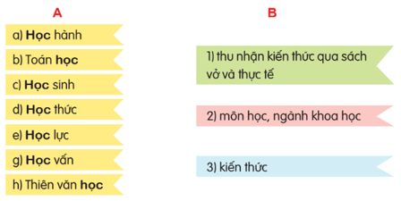 A. HOẠT ĐỘNG KHỞI ĐỘNG a. Mục tiêu - Tạo tâm thế hứng thú cho HS và từng bước làm quen bài học. b. Tổ chức thực hiện - GV cho HS xem video vui nhộn: https://www.youtube.com/watch?v=t2-zfIY0C78 B. HOẠT ĐỘNG HÌNH THÀNH KIẾN THỨC Hoạt động 1: Tìm nghĩa của từ a. Mục tiêu: Thông qua hoạt động, HS sẽ: - Nắm được yêu cầu bài tập. - Trả lời được những câu hỏi trong bài và vận dụng vào những BT có liên quan. b. Tổ chức thực hiện - GV mời 1 HS đọc yêu cầu của BT1, cả lớp đọc thầm theo: Tìm nghĩa của bên B phù hợp với mỗi tiếng học ở bên A: + GV tổ chức cho HS thảo luận nhóm 3 – 4, trả lời câu hỏi (HS làm việc trên phiếu nhóm do GV chuẩn bị sẵn – 1 nhóm làm bài trên phiếu khổ lớn). GV theo dõi, hỗ trợ HS. + GV mời 2 HS nêu ý kiến, một số HS khác nhận xét. + GV nhận xét và chốt đáp án đúng: a), d) -> 1; b), h) -> 2; e),g) -> 3. - GV hướng dẫn HS tra từ điển, tìm nghĩa của các từ học thức, học vấn và những từ khác: + GV gợi ý cho HS một số từ điển Tiếng Việt: + GV nhận xét, chốt đáp án: Học thức: những kiến thức nhờ học tập mà có, thường thể hiện ở sự hiểu biết và cách ứng xử trong đời sống Học vấn: những kiến thức nhờ học tập mà có, thường được đánh giá theo cấp học, bậc học Hoạt động 2: Phân loại nhóm từ a. Mục tiêu: Thông qua hoạt động, HS: - Nắm được nghĩa của từng nhóm từ. b. Tổ chức thực hiện - GV mời 1 – 2 HS đọc BT2: Xếp các từ dưới đây thành 2 nhóm, dựa theo nghĩa của tiếng hành: