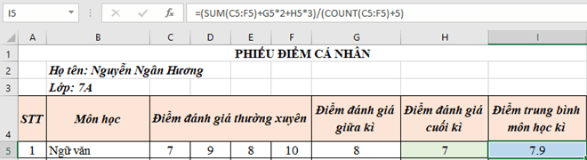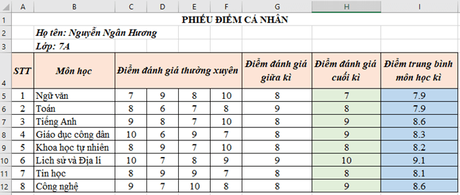 Nhiệm vụ: Em hãy dùng phần mềm bảng tính để tạo một phiếu điểm cá nhân theo mẫu ở Hình 1 Hướng dẫn Bước 1. Tạo bảng Phiếu điểm cá nhân và nhập liệu Bước 2. Căn chỉnh các tiêu đề của bảng cho phù hợp Bước 3. Muốn trộn các ô chọn Merge & Center Bước 4. Điền dữ liệu tự động cho cột STT: gõ hai ô đầu tiên của cột STT, chọn khối ô gồm hai ô này, kéo thả chuột từ điểm tay nắm xuống đến ô cuối trong bảng Bước 5. Điền dữ liệu tự động vào cột Điểm trung bình môn học kì = (tổng điểm thường xuyên+2*Điểm đánh giá giữa kì+3*Điểm đánh giá cuối kì)/(Số điểm đánh giá thường xuyên+5) Hình 4. Điểm trung bình môn tính tự động bằng công thức Bước 6. Trình bày Phiếu điểm cá nhân với các công cụ định dạng |