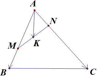 B4. Cho tam giác ABC.Gọi M,N lần lượt là hai điểm lấy trên cạnh AB,AC sao cho AM = 2BM,CN = 3AN,K là trung điểm của MN. Chứng minh rằng: HD: Ta có + K là trung điểm MN nên |