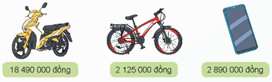 - HS quan sát và suy nghĩ. - HS hoàn thành bài theo yêu cầu. - Kết quả: Xe máy: 18 500 000 đồng Xe đạp: 2 100 000 đồng Điện thoại: 2 900 000 đồng - HS hoàn thành theo yêu cầu. - Kết quả: a) 189 835 388: hàng nghìn, lớp nghìn 5 122 381: hàng triệu, lớp triệu 531 278 000: hàng trăm triệu, lớp triệu b) 189 840 000 5 120 000 531 280 000 - HS hoàn thành bài theo yêu cầu. - Kết quả: 3 121 023 → 3 100 000 3 272 353 → 3 300 000 3 386 097 → 3 400 000 3 254 964 → 3 300 000 - HS lắng nghe và trả lời: + Năm 2018 có lượng xe máy bán ra khoảng 3 400 000 chiếc. + Năm 2017 và năm 2019 có lượng xe máy bán ra gần bằng nhau, khoảng 3 300 000 chiếc. |