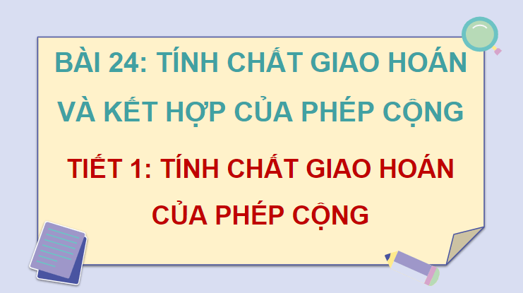 Bài giảng PPT Toán lớp 4 Bài 24: Tính chất giao hoán và kết hợp của phép cộng gồm 45 slide, với nội dung như sau: