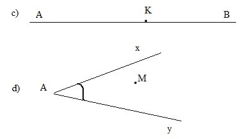 CÂU HỎI TRẮC NGHIỆM CÂU HỎI TỰ LUẬN Câu 1: Vẽ hình trong các trường hợp sau: a) Ba điểm A,B,C thẳng hàng; ba điểm M, N, P không thẳng hàng b) Đoạn thẳng ABAB, trung điểm M của đoạn thẳng AB c) Đường thẳng AB, điểm K nằm trên đường thẳng AB d)Góc xAy và điểm M nằm trong góc đó Câu 2: Cho C là trung điểm của đoạn thẳng AB, O là trung điểm của đoạn thẳng AC a) Hãy tìm độ dài của AC, CB và AO nếu AB = 2cm b) Hãy tìm độ dài của AB, AC và AO nếu CB = 3,4 cm Câu 3: Trong hình vẽ dưới đây, hãy kể tên tất cả các góc. Dùng thước đo và sắp xếp số đo của chúng theo thứ tự giảm dần |