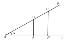 Cho góc nhọn = . Xét tam giác ABC vuông tại A, tam giác A'BC' vuông tại A' với A, A' thuộc tia Bx và C, C' thuộc tia By. Do ABC A'BC' nên . Như vậy, tỉ số giữa cạnh đối AC của góc nhọn và cạnh huyền BC trong tam giác vuông ABC không phụ thuộc vào việc chọn tam giác vuông đó.