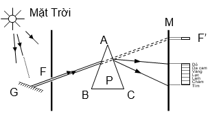 I. Thí nghiệm về sự tán sắc ánh sáng của Niu-tơn (1672) - Kết quả: + Vệt sáng F’ trên màn M bị dịch xuống phía đáy lăng kính, đồng thời bị trải dài thành một dải màu sặc sỡ. + Quan sát được 7 màu: đỏ, da cam, vàng, lục, làm, chàm, tím. + Ranh giới giữa các màu không rõ rệt. - Dải màu quan sát được này là quang phổ của ánh sáng Mặt Trời hay quang phổ của Mặt Trời. - Ánh sáng Mặt Trời là ánh sáng trắng. - Sự tán sắc ánh sáng: là sự phân tách một chùm ánh sáng phức tạp thành các chùm sáng đơn sắc. |