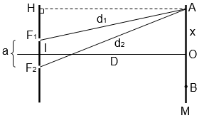 Bài 9 (trang 133 SGK Vật Lý 12): Một khe hẹp F phát ánh sáng đơn sắc, bước sóng λ = 600mm chiếu sáng hai khe F1, F2 song song với F và cách nhau 1,2mm. Vân giao thoa được quan sát trên một màn M song song với mặt phẳng chứa F1, F2 và cách nó 0,5m. a) Tính khoảng vân. b) Xác định khoảng cách từ vân sáng chính giữa đến vân sáng bậc 4. |