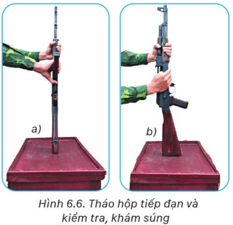 + Tay trái nắm ốp lót tay, giữ súng dựng đứng trên bản (bạt, chiếu, ni lông,...), đầu nòng súng hướng lên trên, mặt súng quay sang trái. Tay phải nắm hộp tiếp đạn, ngón cái bóp vào lẫy giữ hộp tiếp đạn (hình 6.6a), đẩy hộp tiếp đạn lên, tháo ra và đặt lên bàn.