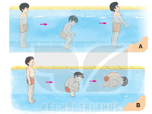 - Động tác: Hít một hơi thật sâu, ngồi xuống chìm đầu trong nước rồi thở ra từ từ (bằng miệng hoặc mũi). Khi thở ra gần hết thì đạp chân vào đáy bể (hồ); bật nhảy nhô đầu lên khỏi mặt nước, hít hơi vào.