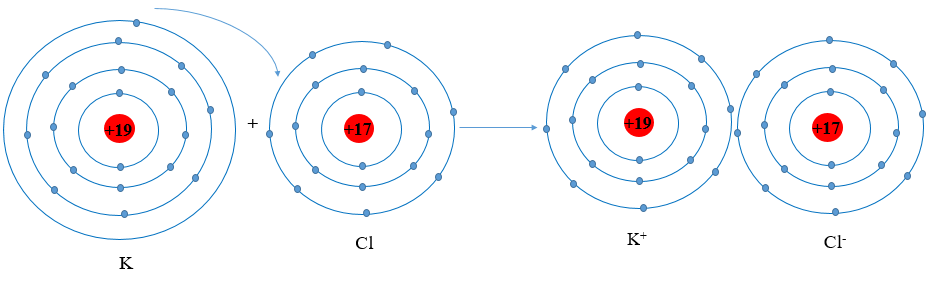 - Nguyên tử Cl (Z = 17): 1s22s22p63s23p5 ⇒ Có 7 electron lớp ngoài cùng ⇒ Có xu hướng nhận 1 electron từ nguyên tử K để đạt cấu hình electron giống khí hiếm.