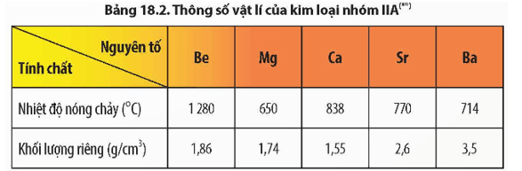 - Tính chất vật lí: Nhiệt độ nóng chảy, khối lượng riêng và độ cứng của kim loại nhóm IIA cao hơn so với kim loại nhóm IA cùng chu kì. Kim loại nhóm IIA là những kim loại nhẹ (D < 5 gam/cm3).