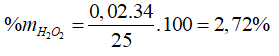 Câu 23: Để xác đinh hàm lượng hiđro peoxit trong 25g một loại thuốc làm nhạt màu tóc cần 80ml dd KMnO4 0,1M trong môi trường H2SO4. Hàm lượng của hiđropeoxit trong loại thuốc nói trên là