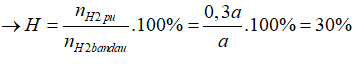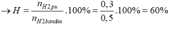 Bài 4: Cho 25 lít N2 và 60 lít H2 vào bình phản ứng, hỗn hợp thu được sau phản ứng có thể tích bằng 75 lít (thể tích các khí đo ở cùng điều kiện). Hiệu suất phản ứng là:
