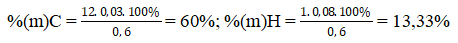 mA = mC + mH = 0,6.12 + 0,3.2 = 7,8 gam ⇒ %(m)C = 7,2.100%/7,8 = 92,3% ⇒%(m)O = 7,75