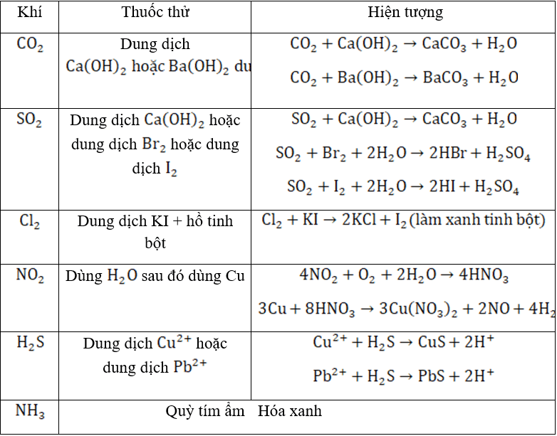 BẢNG TỔNG HỢP NHẬN BIẾT CHẤT KHÍ