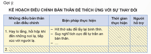 - HS xây dựng kế hoạch điều chỉnh bản thân để thích ứng với sự thay đổi theo bảng gợi ý trên.